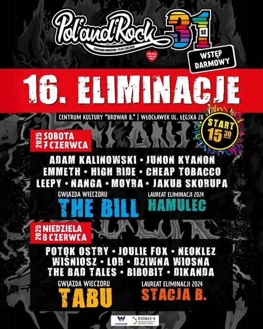W dniach 7–8 czerwca 2025 roku Centrum Kultury „Browar B.” we Włocławku stało się sercem polskiej sceny muzycznej, goszcząc 16. Eliminacje do Pol’and’Rock Festival. Wstęp na wydarzenie był bezpłatny, co przyciągnęło liczną publiczność spragnioną muzycznych emocji.